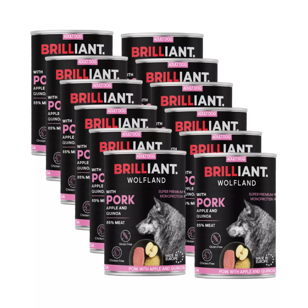 A Brilliant Wolfland Sertés, Alma és Quinoa konzerv teljes értékű, szuperprémium minőségű nedves eledel, amelyet kifejezetten érzékeny, válogatós vagy ételintoleranciával küzdő kutyák számára fejlesztettek ki.